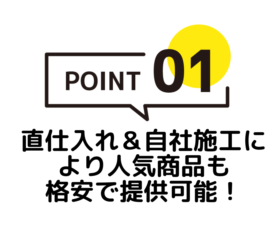 当社で扱う商品はメーカーから直接仕入れることができるので、品質は保証付き!さらに卸を介さないため、費用も抑えることができるのです!